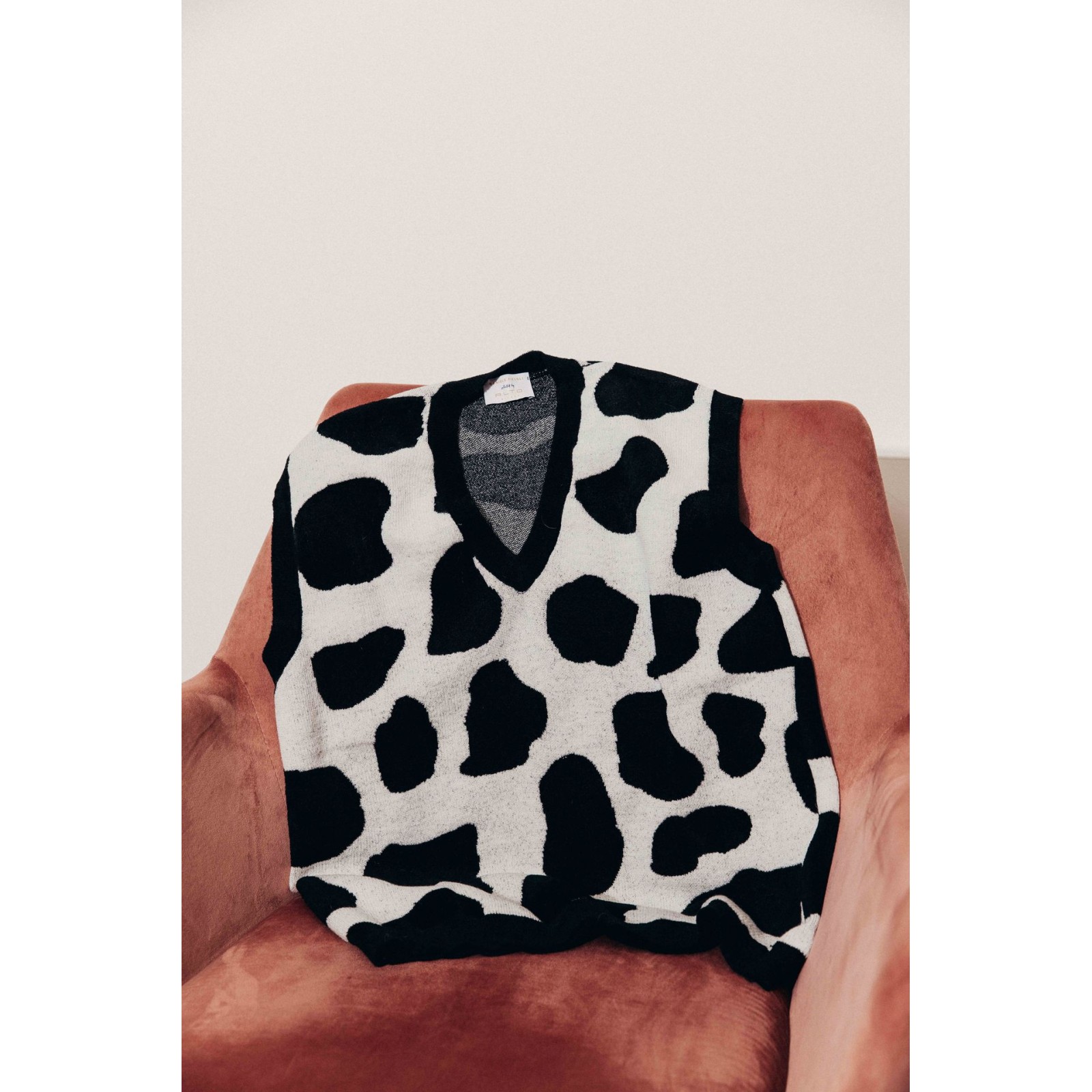 Cowvest è un gilet in lana merino extrafine e giselle in fantasia animalier con una vestibilità morbida - La modella in foto indossa una taglia S ed è alta 160 cm